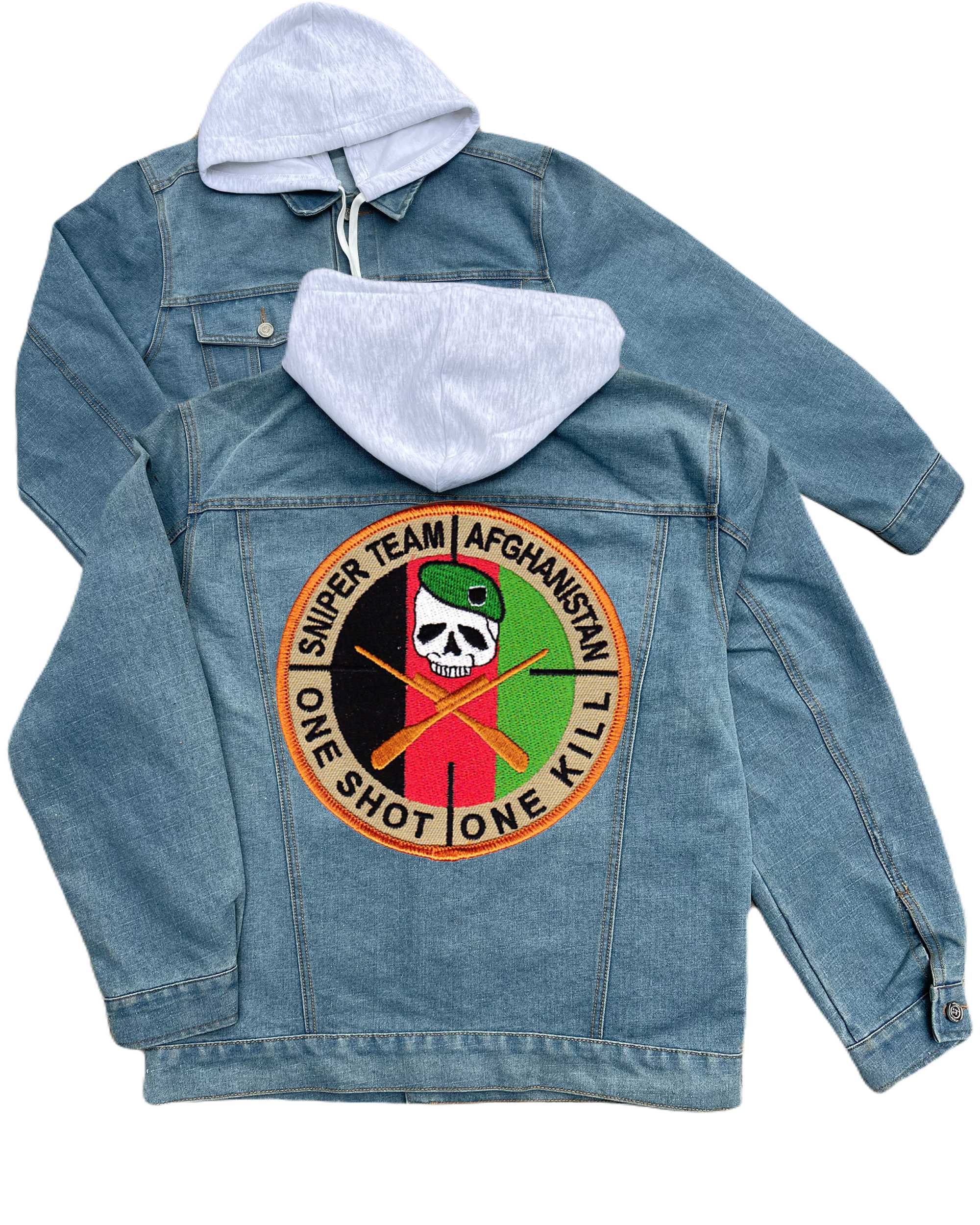 Special Forces Group Sniper Team Embroidered Hood Jean Jacket Afghanistan Sniper Skull