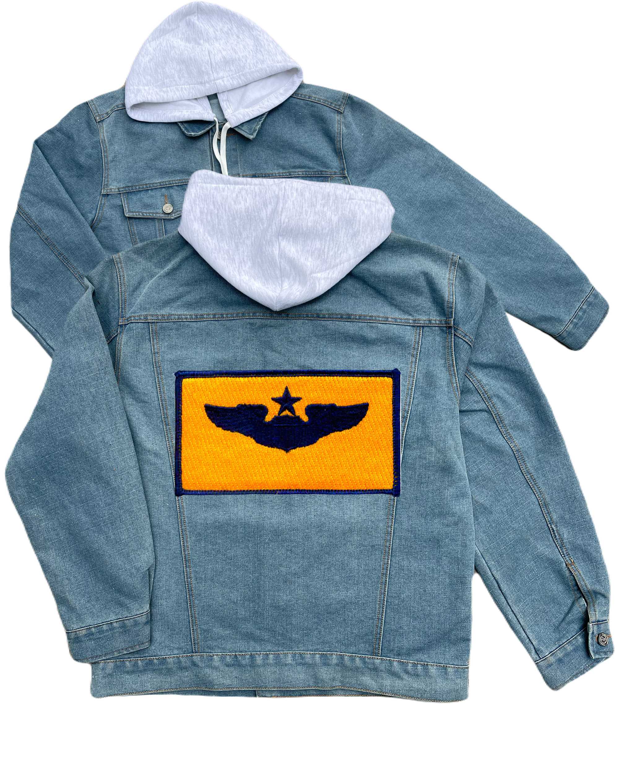 Senior Pilot Wings Embroidered Hood Jean Jacket Gold And Blue