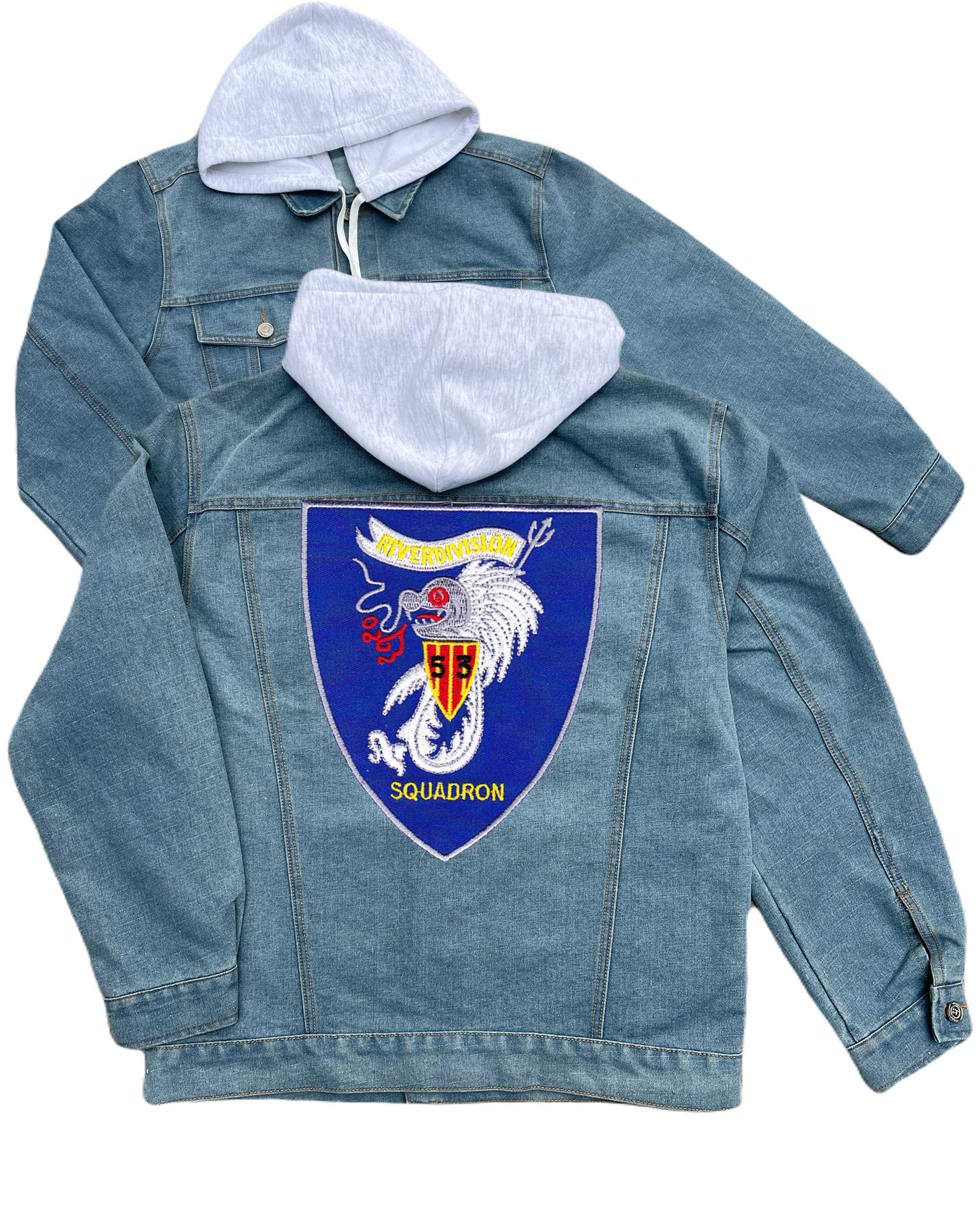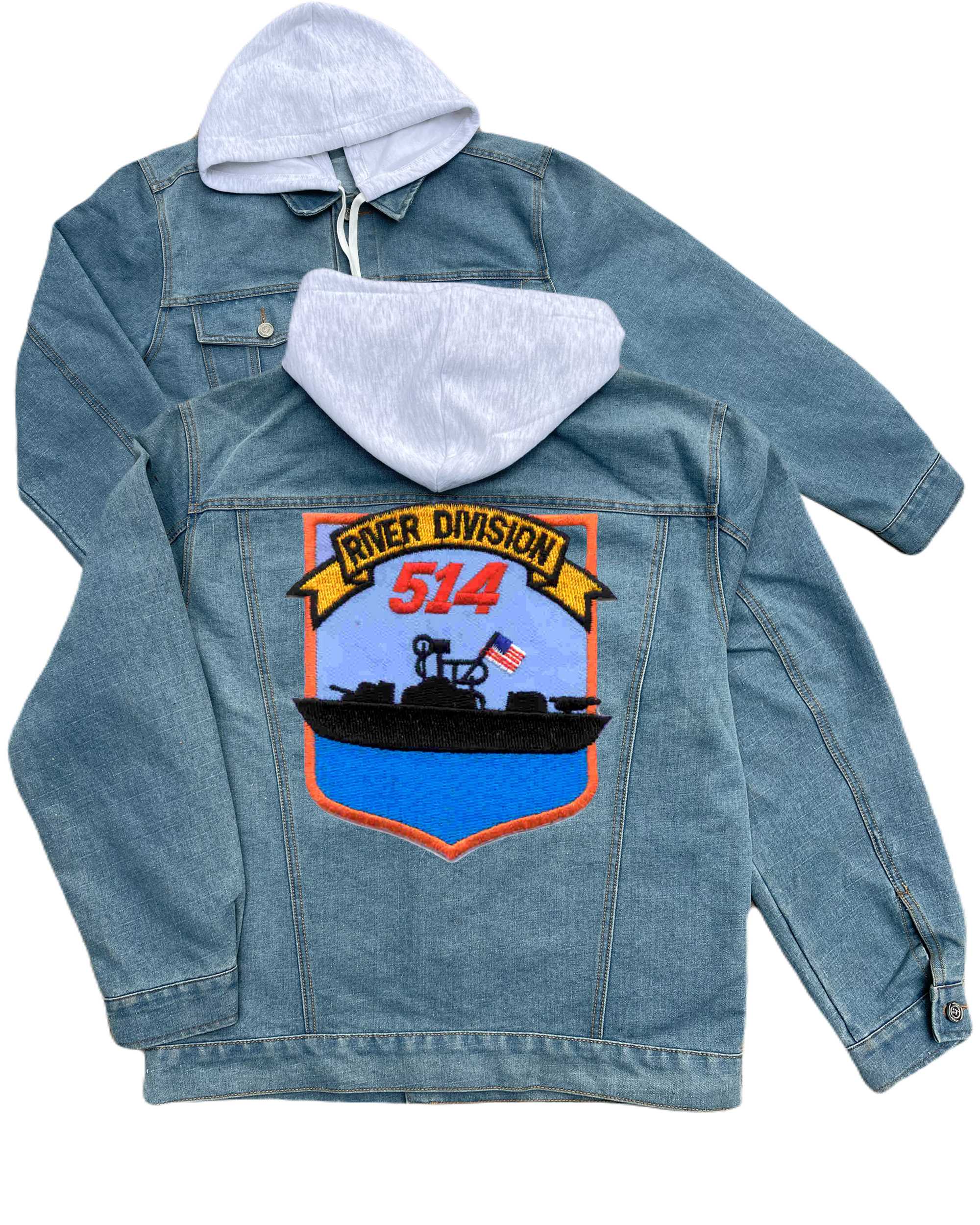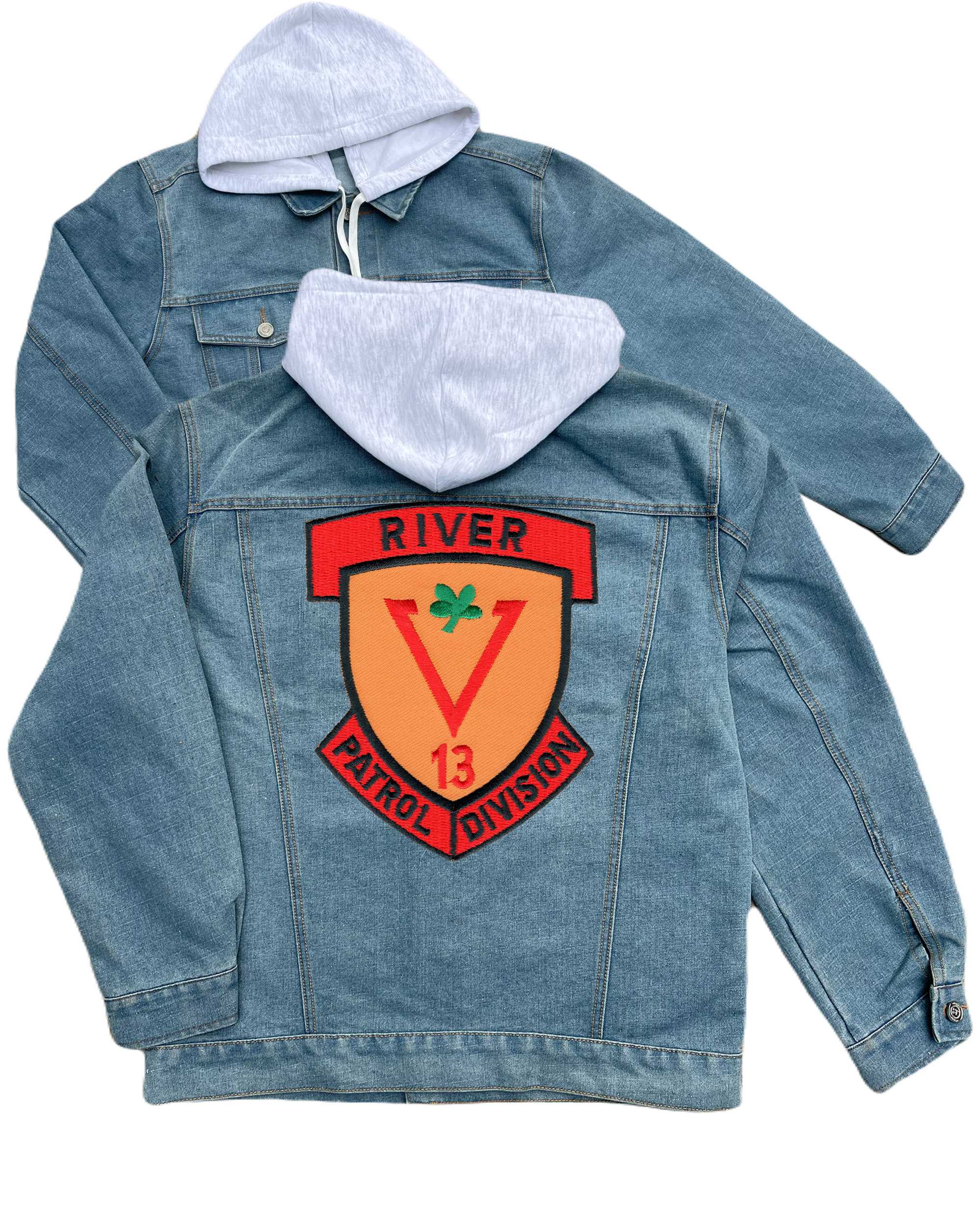 Rivdiv 513 River Patrol Division Embroidered Hood Jean Jacket Clover Leaf