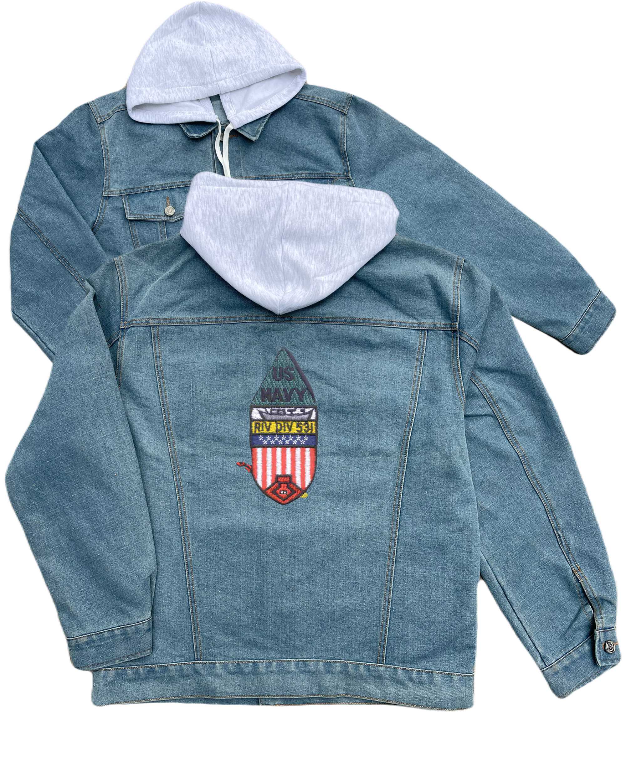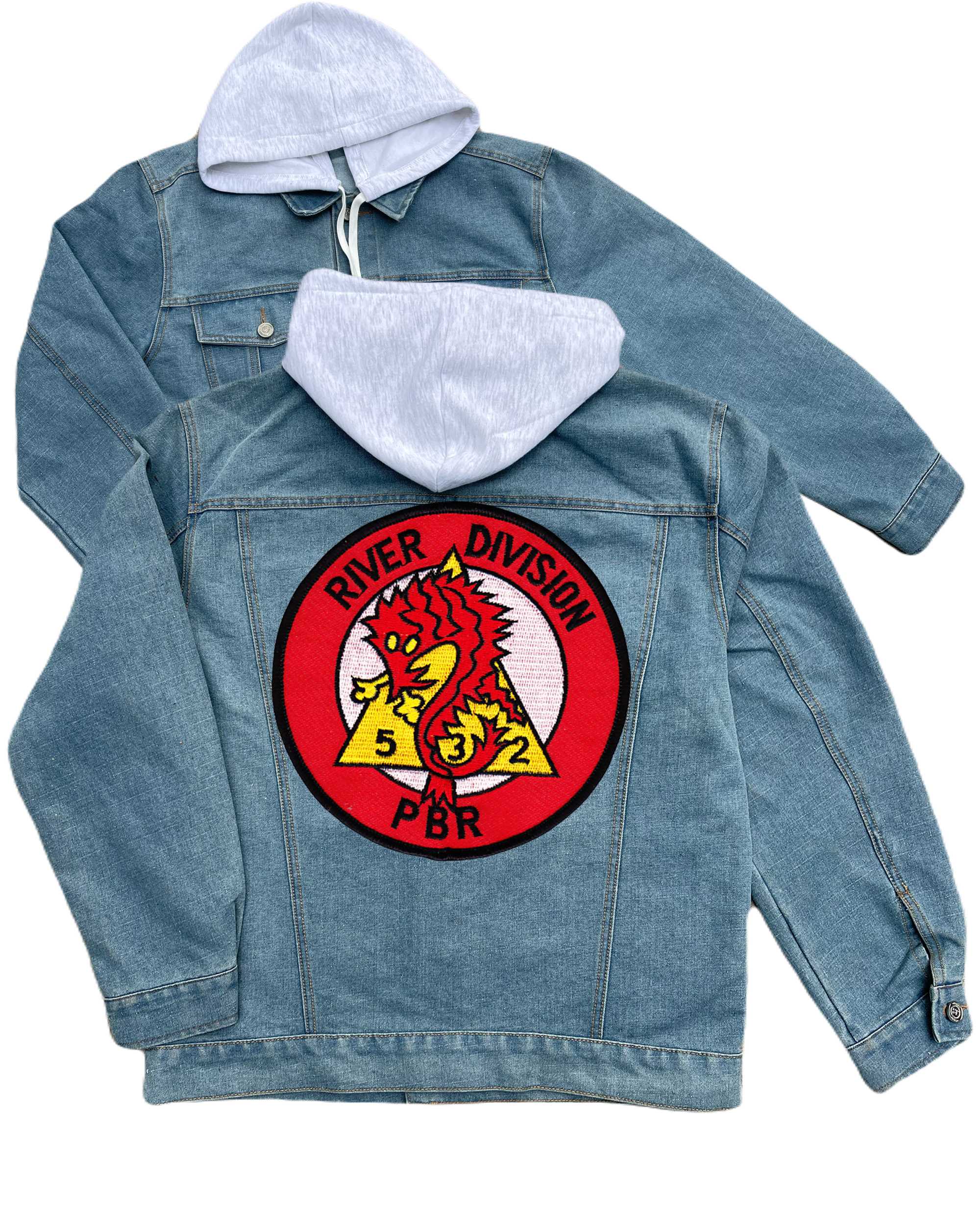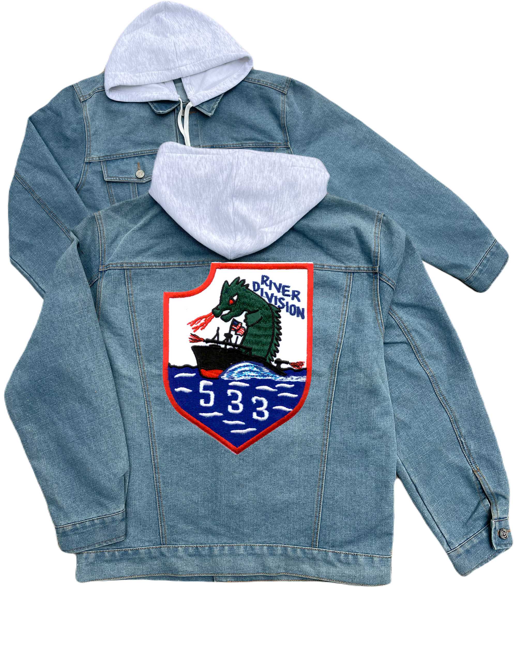 Rivdiv 513 River Patrol Division Embroidered Hood Jean Jacket Clover Leaf
