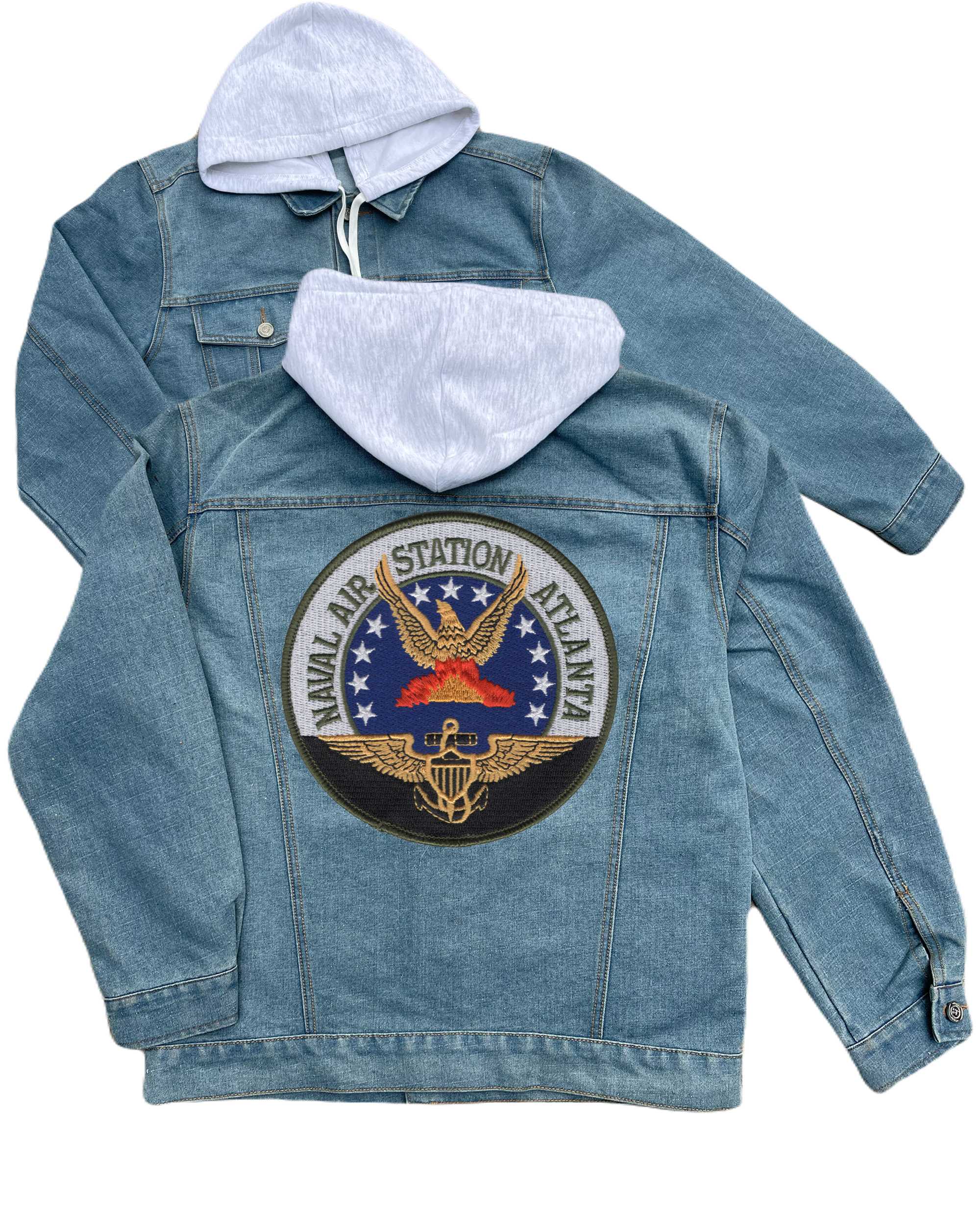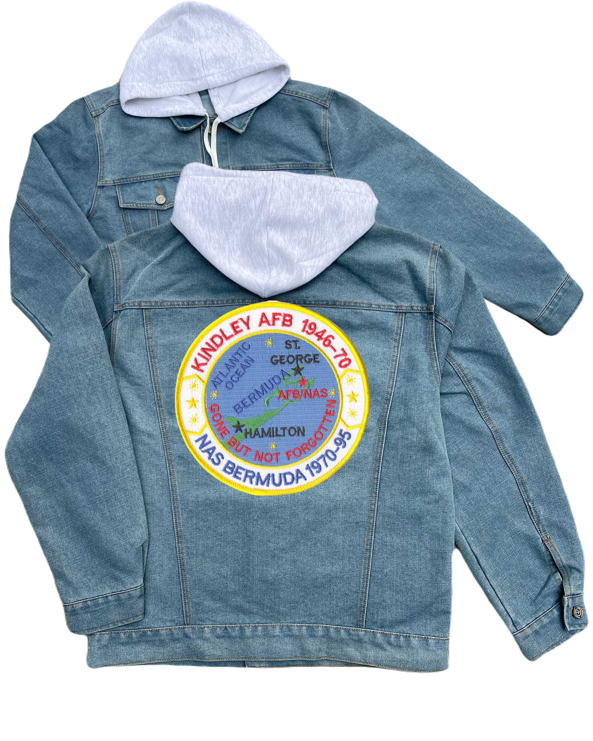 Naval Air Station Bermuda Embroidered Hood Jean Jacket Gone But Not Forgotten