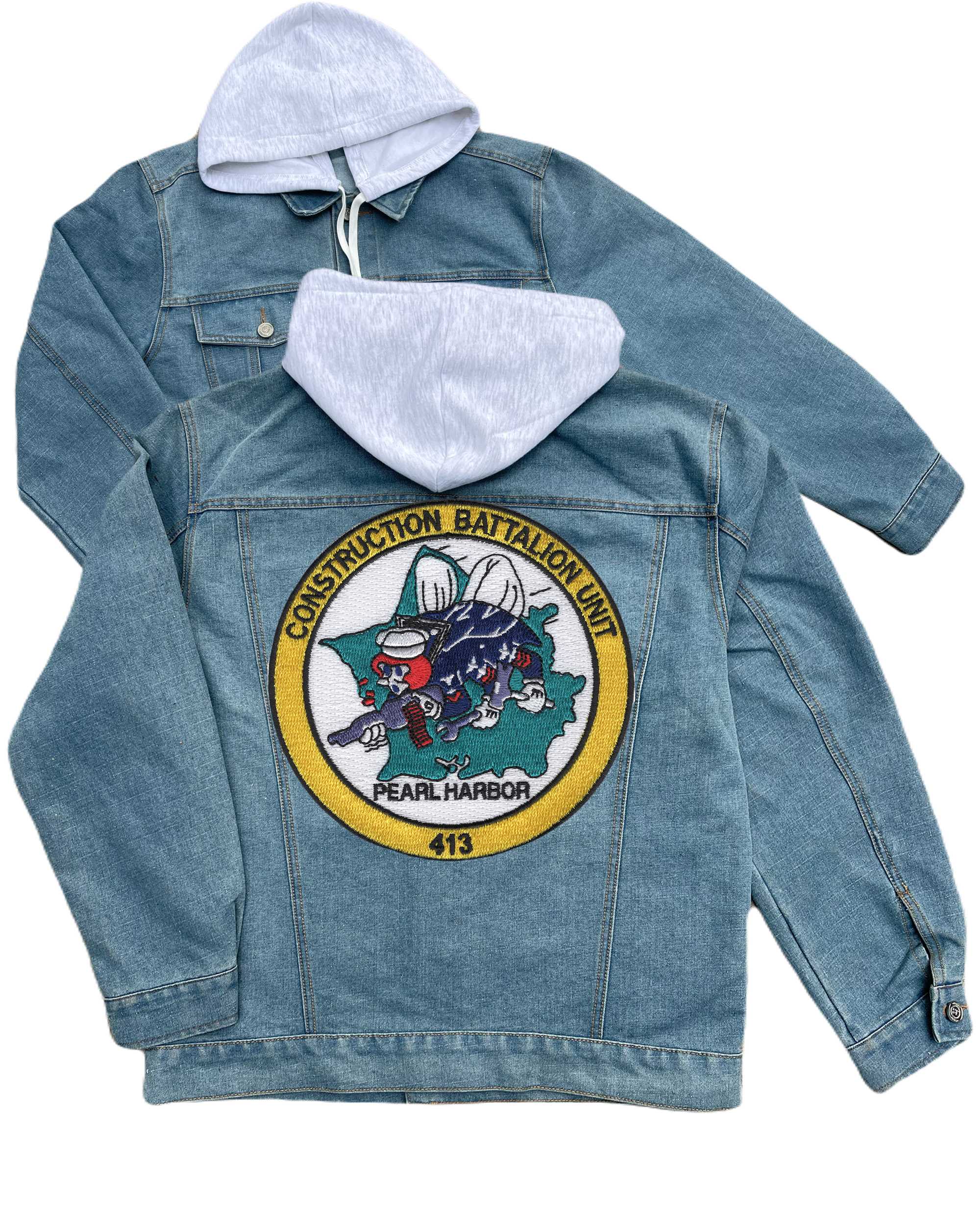 Naval Construction Battalion Unit 413 Embroidered Hood Jean Jacket Cbu 413 Pearl Harbor