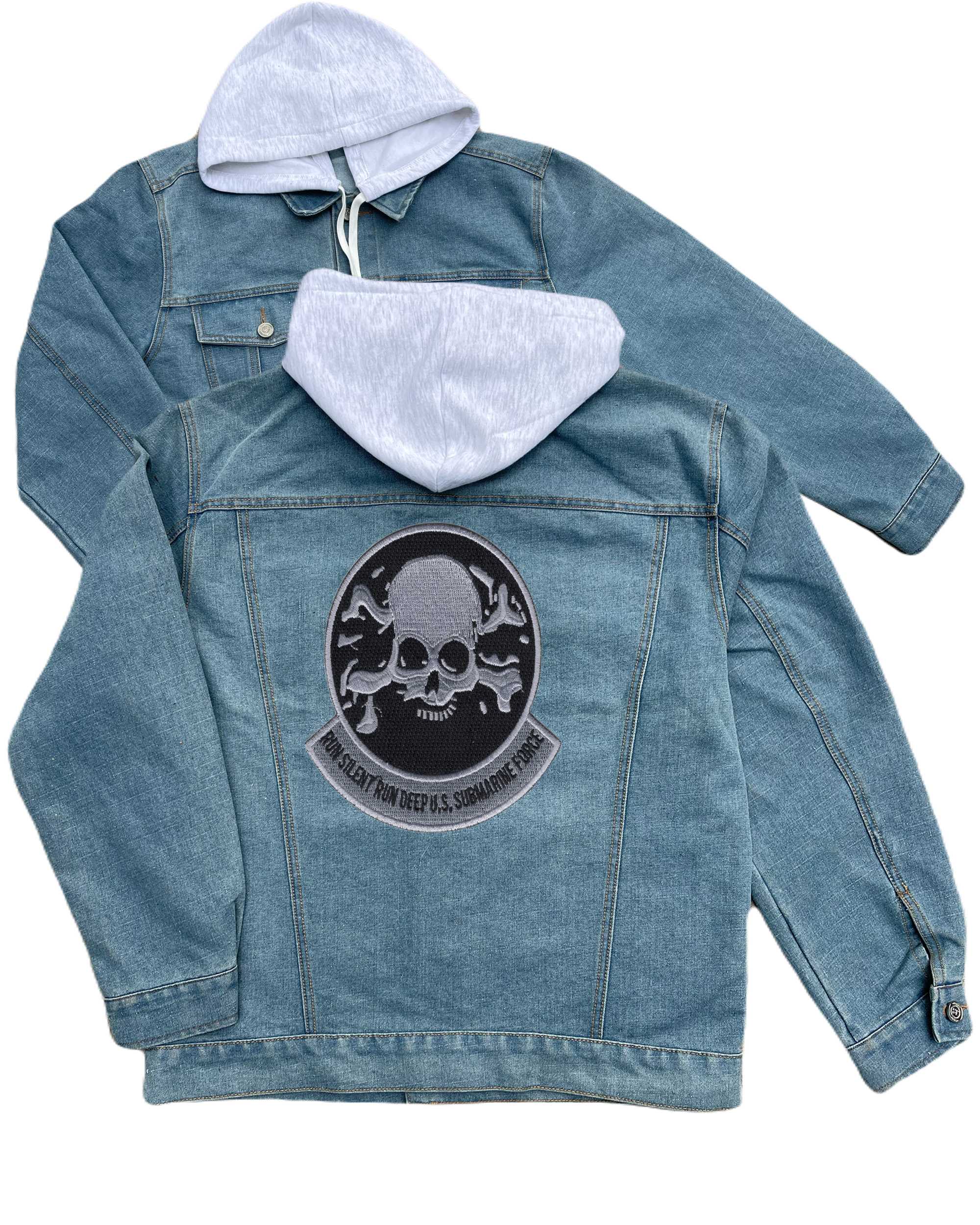 Skull And Crossbones Run Silent Run Deep Embroidered Hood Jean Jacket