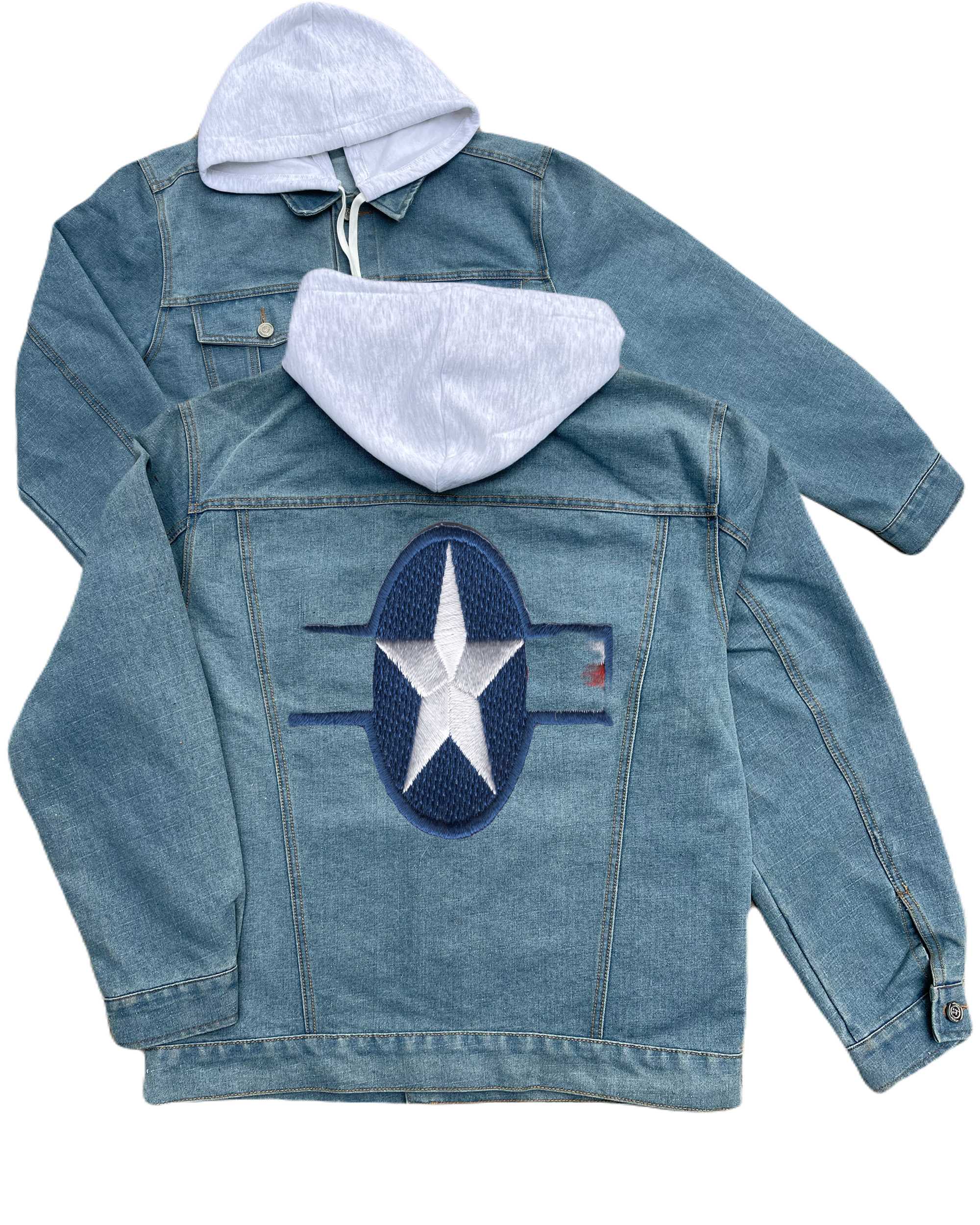 U S Flag Silver Right Sleeve Embroidered Hood Jean Jacket